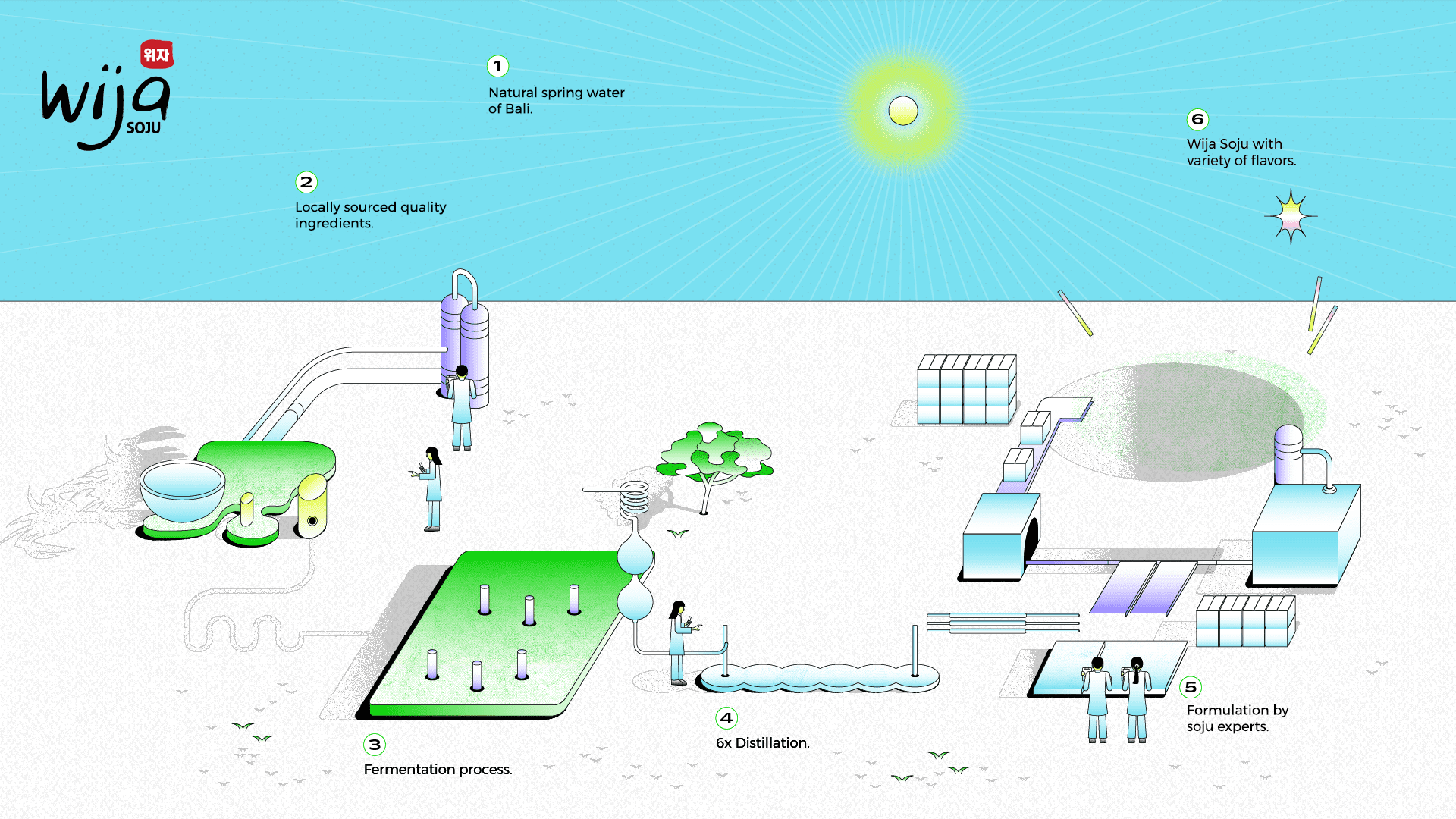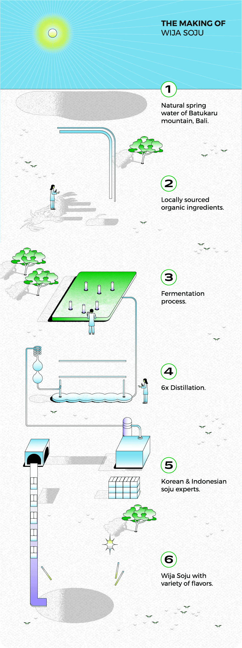 Made fresh on the island of Bali, Wija Soju has the character of authentic Korean soju with the twists of local flavors. Respecting the heritage and putting our stamp on it at the same time. Bridging the best of both worlds.